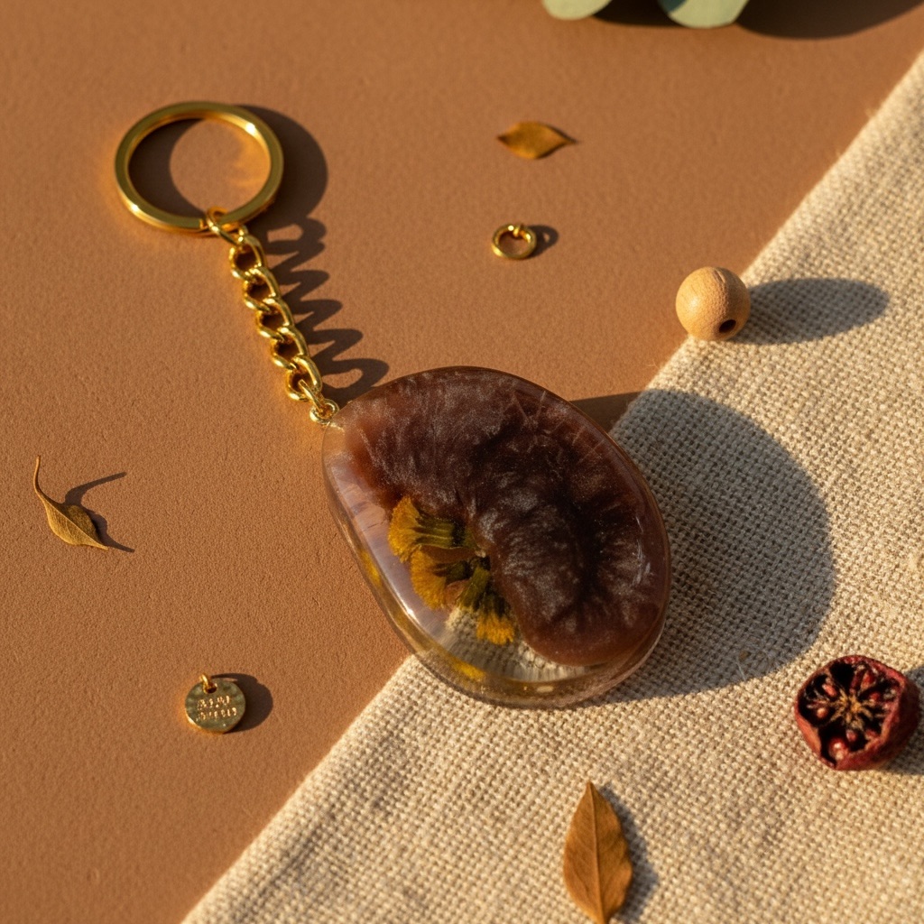 Cada chaveiro Fleur d’Or guarda uma flor natural preservada em resina cristal, revelando cores, texturas e um brilho suave que muda conforme a luz.