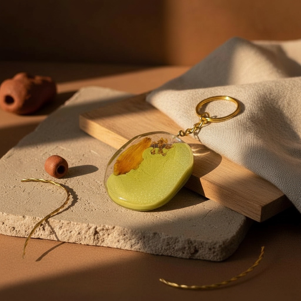 Cada chaveiro Fleur d’Or guarda uma flor natural preservada em resina cristal, revelando cores, texturas e um brilho suave que muda conforme a luz.