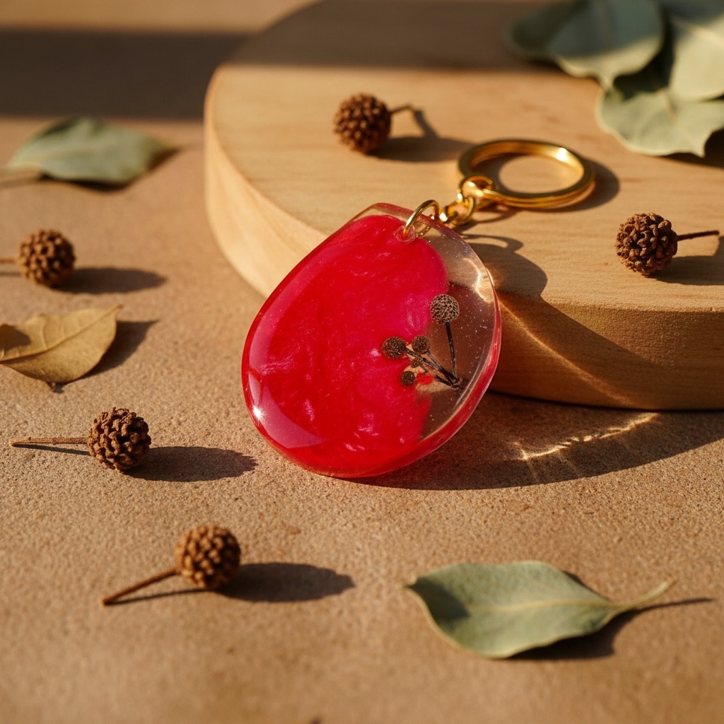 Chaveiro com Flor Natural em Resina Vermelho Vivo Translúcido